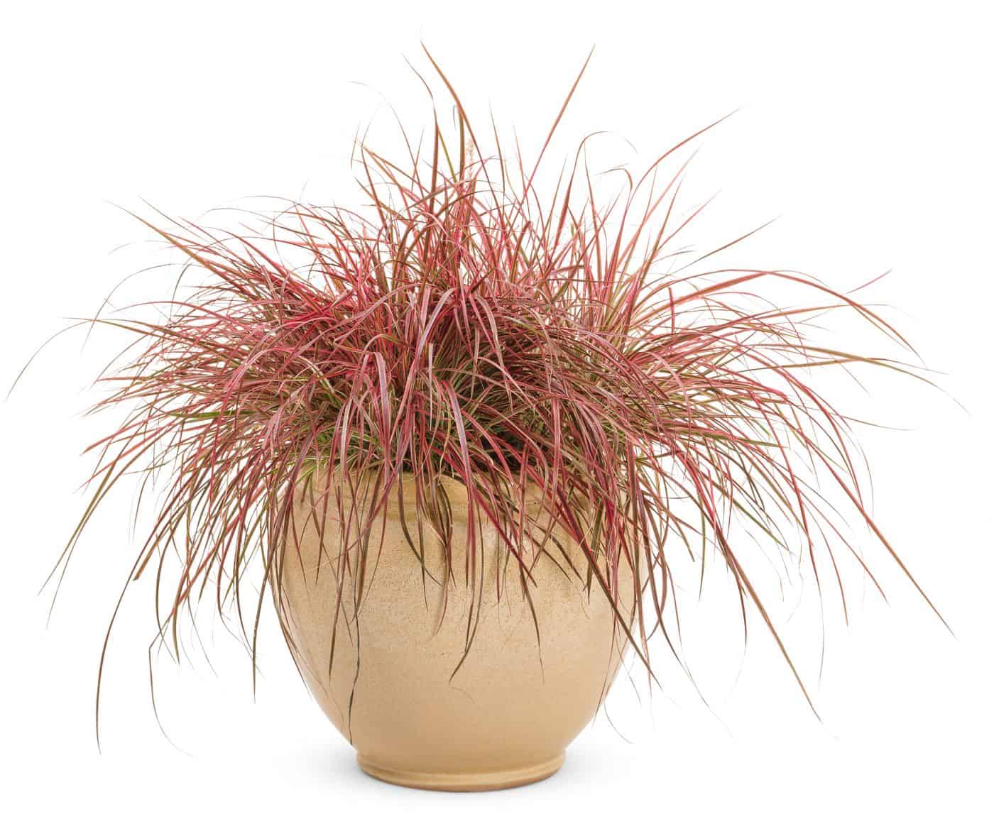 - Rubrum – Reddish stems, leaves, and seed heads; great for large containers. Also known as Purple Fountain Grass.