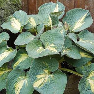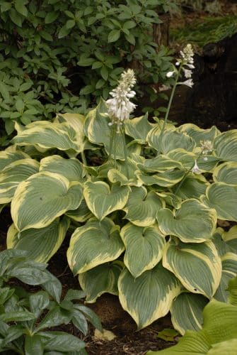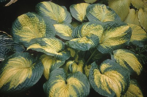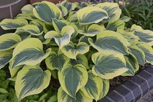 - Great Expectations – Gold puckered leaves with wide blue-green margins. white flowers, 20″ tall x 40″ wide, Large variety