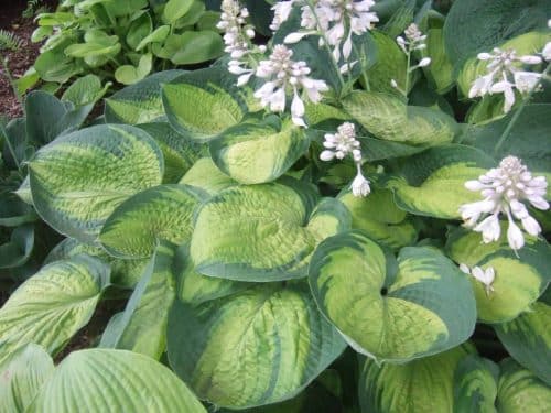 - Brother Stefan – Forms large clumps of thick puckered leaves that are chartreuse with a blue margin, near white flowers, 20″ tall x 36″ wide, Large variety