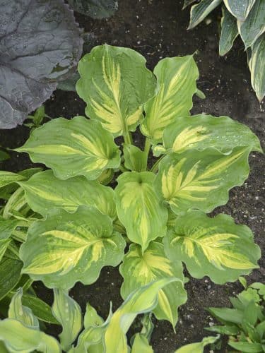 - Earth Angel – Large blue-green leaves with wide creamy yellow margins, pale lavender flowers, 30″ tall x 40″ wide, Giant variety