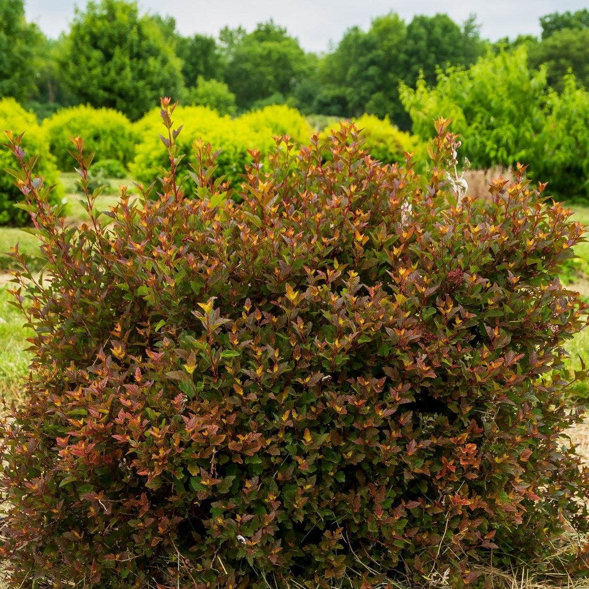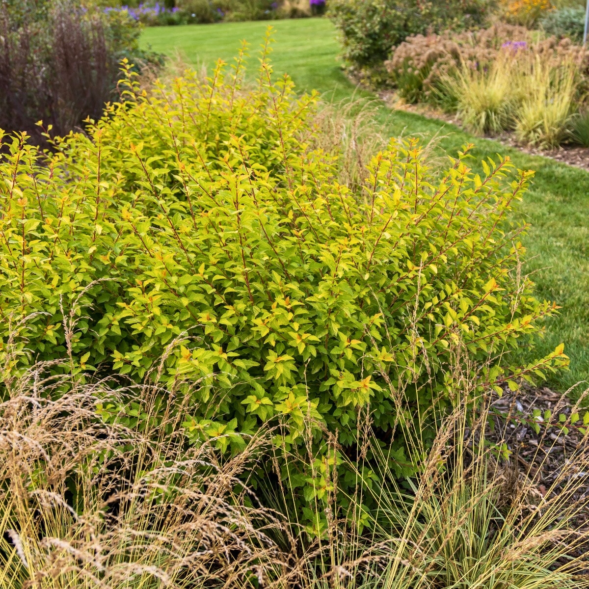 Lucky Devil – Golden yellow foliage that resembles a forsythia in spring. Appreciates afternoon shade in summer! 3-4 ft tall and wide.