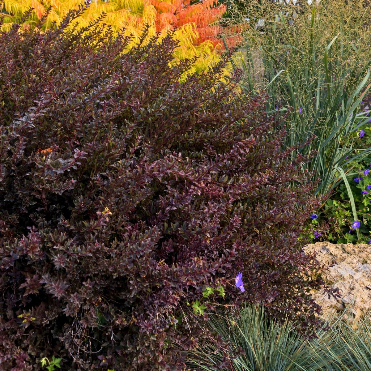 Spicy Devil – Hot copper-tipped stems against dark burgundy foliage. 3-4 ft tall and wide.