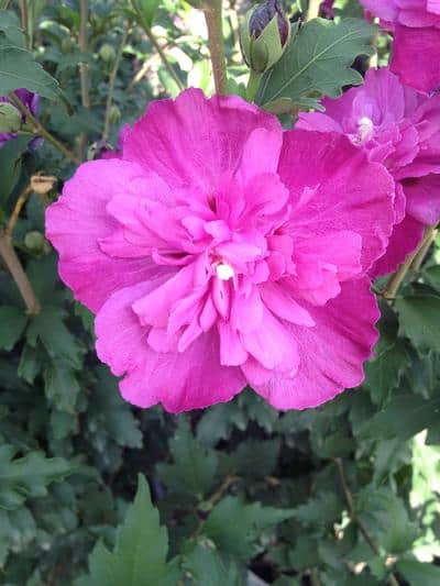 The Smoothie series of Rose of Sharon are medium sized shrubs that bloom from mid-late summer. They mature at 8′ tall and 4′ wide, growing upright with serrated green leaves.
